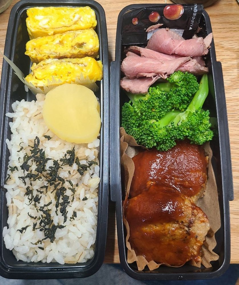 前は学食のメニューにタンパク質と野菜を足す弁当だったんですけど、考えた末に学食の日と、弁当の日に分けることにしました。昨晩のハンバーグをメインに。