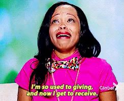 a woman in a pink shirt says " i 'm so used to giving "