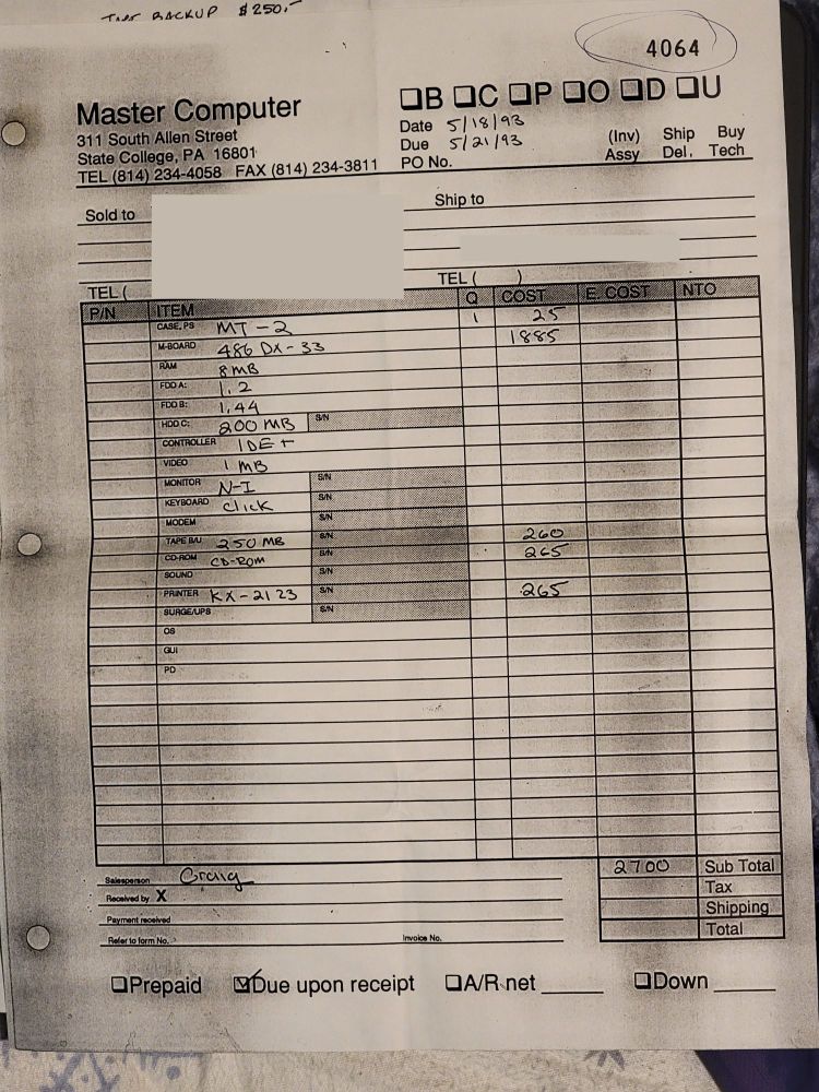 I found some interesting receipts/pricing documents for our first home PC in 1993. (I'm pretty sure my dad's work paid for it.)