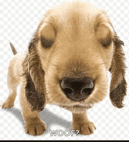 ALT: a cocker spaniel puppy with its eyes closed and the word woof written below it