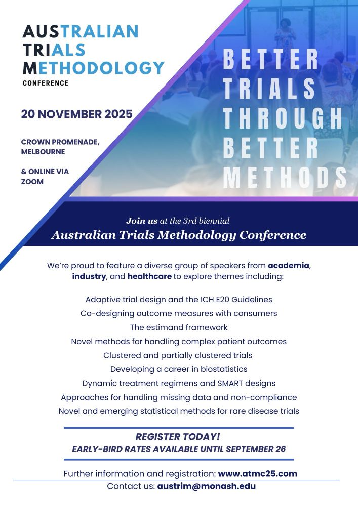 📢 Australian Trials Methodology Conference 2025 🗓 20 Nov | 📍Melbourne & Online via Zoom Join leading speakers from academia, industry & healthcare. 🎟 Early-bird rates until 26 Sep! 🔗Register: atmc25.com #ClinicalTrials#TrialMethodology#Biostatistics @vicbiostat.bsky.social