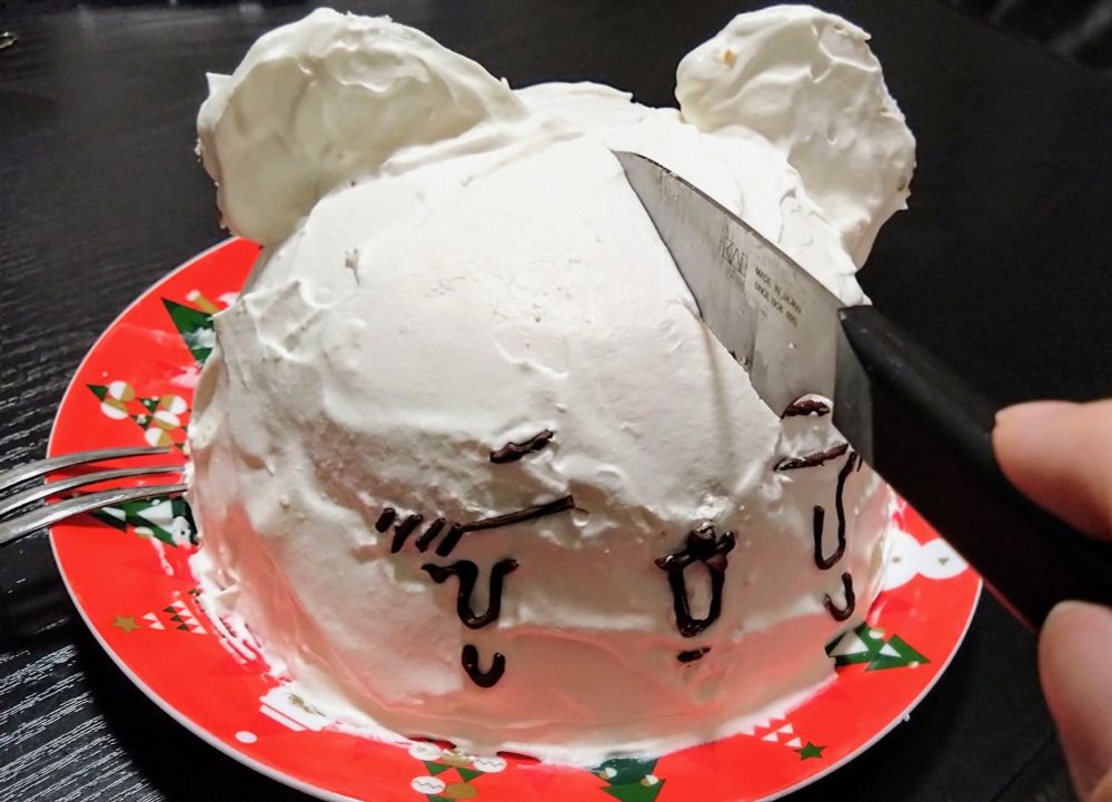 ジェネリックちいかわケーキもした、スパチュラなくてナッペ雑すぎるし顔のパーツ配置難しい 精進 買ったスポンジ足りんなって耳はシュトーレンの余りぶっ刺した