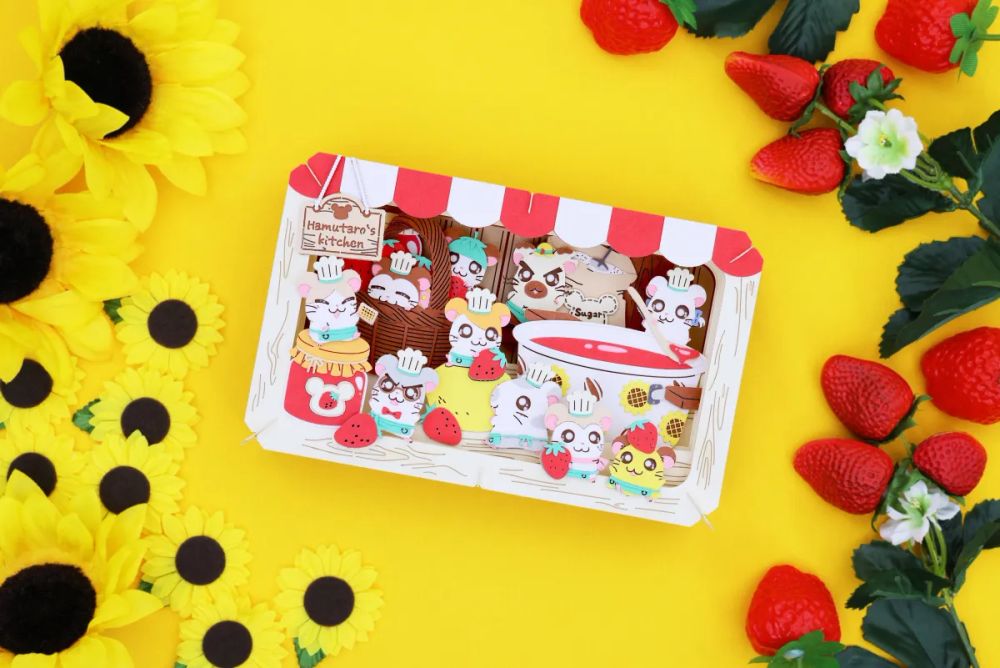 エンスカイより、人気キャラクターのハムちゃんずが描かれた新しいペーパーシアターが登場します。手足の小さなパーツが多く、立体的なアートでジャム作りを楽しめる内容です。