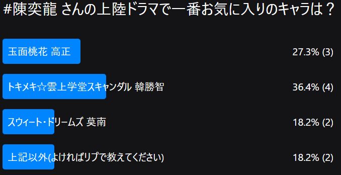 "#陳奕龍 さんの上陸ドラマで一番お気に入りのキャラは?" asked by @caoyaosan.bsky.social. Vote below!
