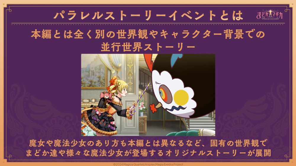 魔女や魔法少女のあり方も本編とは異なるなど、固有の世界観でまどか達や様々な魔法少女が登場するオリジナルストーリーが展開されます。