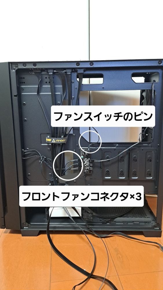 ファンスイッチのピンはマザボのリセットピンヘッダーに差して、機能をリセットスイッチに変更。フロントファンのコネクタも分岐ケーブルでマザボにつなぎ、背面ファンもマザボにつなぐ。