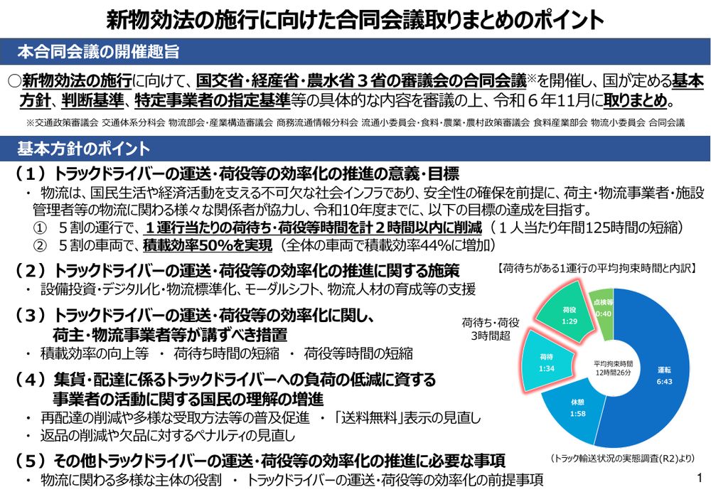 産業構造審議会商務流通情報分科会流通小委員会・食料・農業・農村政策審議会食料産業部会物流小委員会との合同会議取りまとめ。「流通業務の総合化及び効率化の促進に関する法律及び貨物自動車運送事業法の一部を改正する法律」(物流改正法)による改正後の「物資の流通の効率化に関する法律」(新物効法)施行に向けた規定。