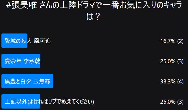 "#張昊唯 さんの上陸ドラマで一番お気に入りのキャラは?" asked by @caoyaosan.bsky.social. Vote below!