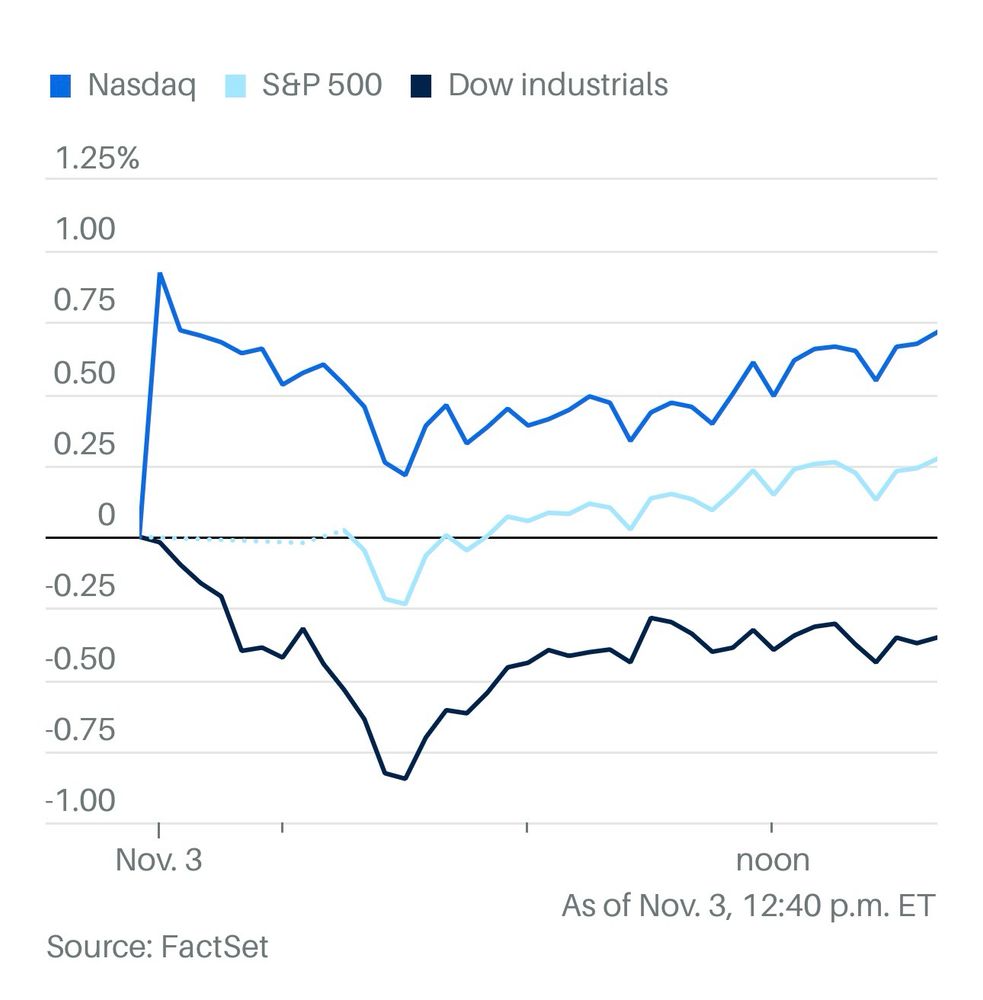 道指跌幅0.4%。标普500跌略涨,成分股中仅不到70只只上涨,涨幅最大的股票都与人工智能有关。纳指则涨0.58%。