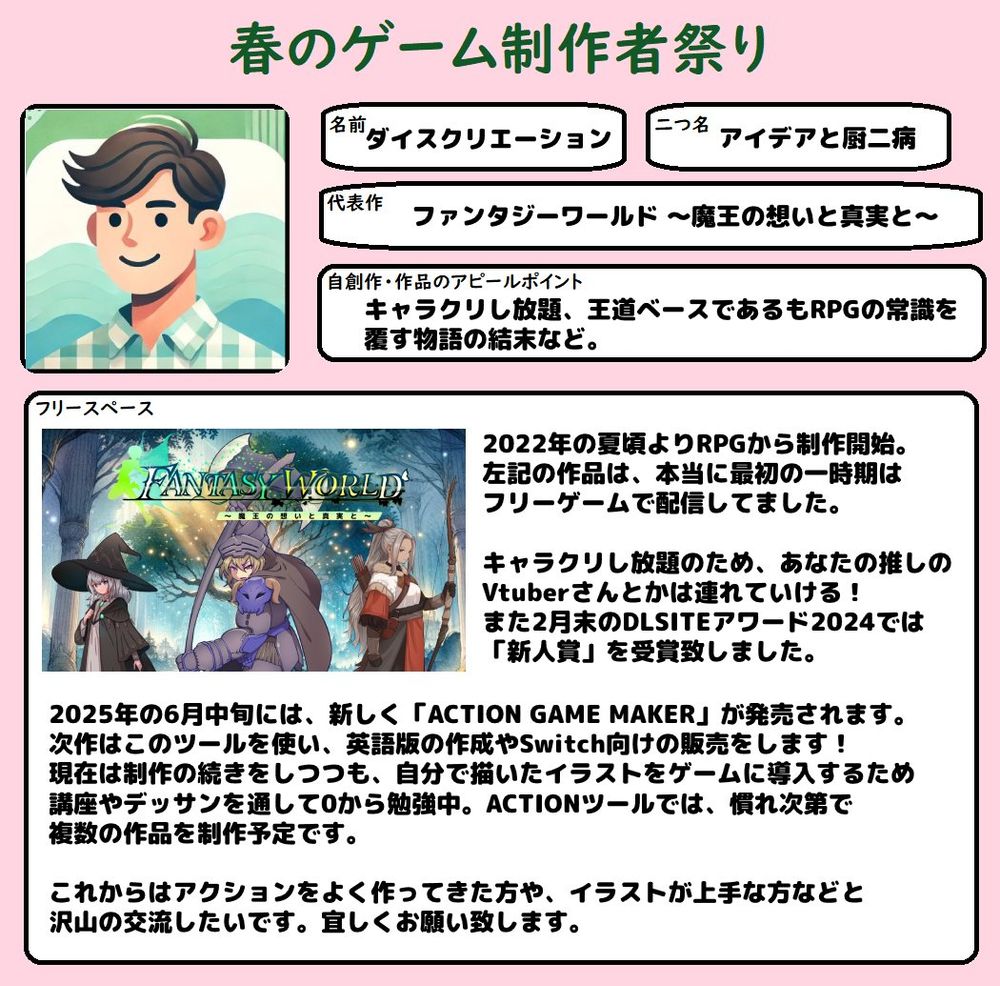 「だんじょんRPG_天魔の塔」 「熱き絆のラプソディ ~今こそ共闘を!!~」の2本を公開中で、現在は「十聖珠 ~世界を動かす者達の狂騒曲~」を制作中です。