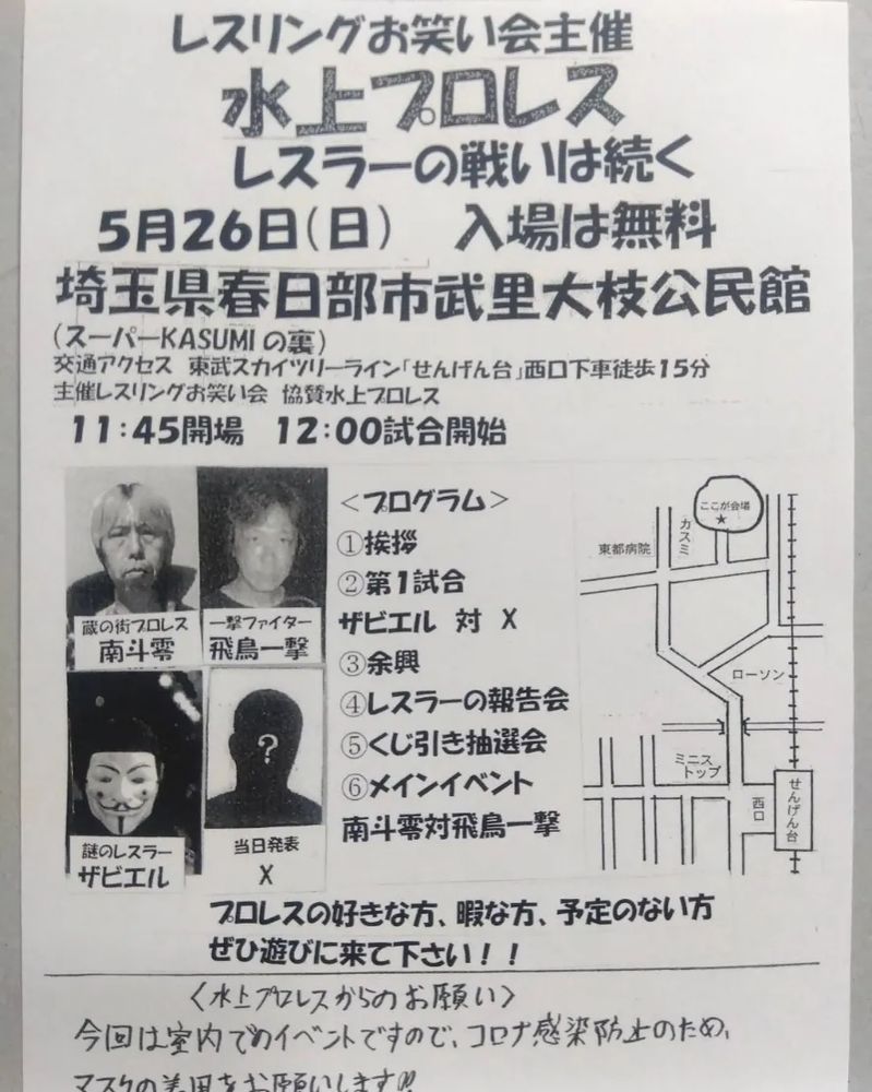 10月20日㈰水上プロレスわらじバザーの大会の日ですが、自宅にアメリカに住んでいるおじさんが15時00分に来て挨拶や接待などしなければならないので試合終了後すぐに帰宅しなければ間に合いませんので試合終了後は皆様は私に絶対に話し掛けないでください。