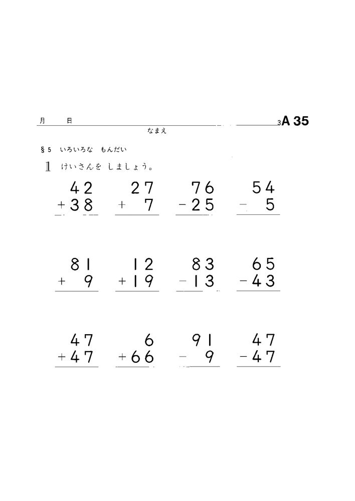 2Aは2位数同士のたし算、ひき算のプリントです