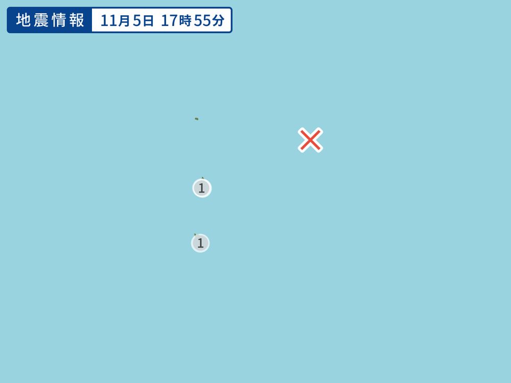 2025年11月05日 17時59分ころ、父島近海で、最大震度1の地震がありました。震源の深さは0km、マグニチュードは4.8と推定されます。この地震による津波の心配はありません。