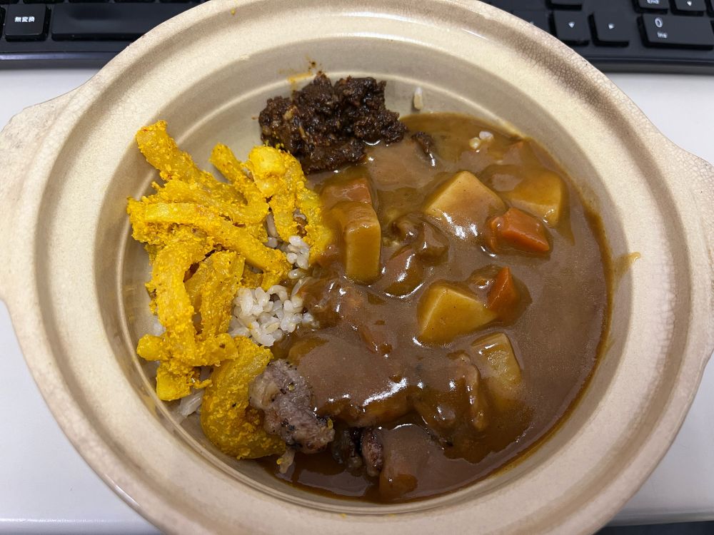 玄米とムラコ・アチャール(ネパールの大根漬け)とバフ・スクティ・ピクルス(水牛の干し肉の油漬け)と焼き鳥(豚バラ)を入れてビーフカレーをかけたオフィススタイルカレー。