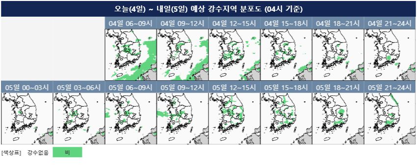 케이웨더/기상청의 오늘과 내일 기상예보를 보면, 전국이 흐리고 비가 온다고 예상하고 있습니다. 오늘은 예상 강수량이 남부 지방 20~60mm, 그 외 지역 5~30mm정도로 적습니다만 강원영동 남부와 경북북부동해안 지역에는 지형 효과로 인해 시간당 20mm 안팎의 강한 비가 일시적으로 올 수도 있겠습니다.