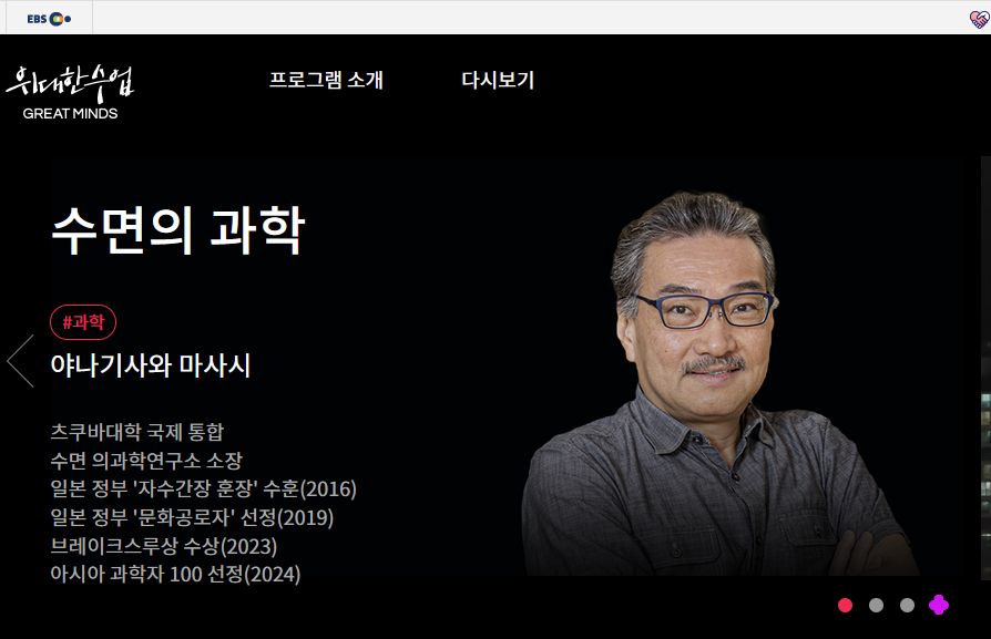 자칭EBS봇입니다) 오늘밤 11시 40분 EBS에서 위대한 수업, 그레이트 마인즈 시즌5 [야나기사와 마사시 <수면의 과학> 2강. 수면 부족이 성장, 비만, 치매에 미치는 영향] about.ebs.co.kr/kor/pr/highl... x.com/EBSstory/sta... about.ebs.co.kr/board/bbs?bo... 합니다. 다시보기 home.ebs.co.kr/greatminds/r... 프로그램 홈페이지 home.ebs.co.kr/greatminds/i... www.youtube.com/@EBS_story/s...