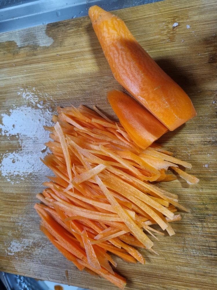 도마는 기름기가 없는 오이, 당근(+표고)을 먼저 썰고 햄, 맛살을 썹니다. 팬은 기름을 넉넉하게 써서 부쳐야 하는 계란을 먼저 부치고, 햄,맛살,당근,표고 순으로 익히고 볶습니다. 계란은 가운데를 나눠서 겹쳐 자르면 썰기 편해요. 햄과 맛살은 같이 익혀도 됩니다. 넉넉하게 둘렀던 기름은 당근을 익히면서 당근이 다 빨아먹고요, 당근은 소금으로 간하여 뚜껑을 닫고 약불로 익혀야 타지 않습니다.