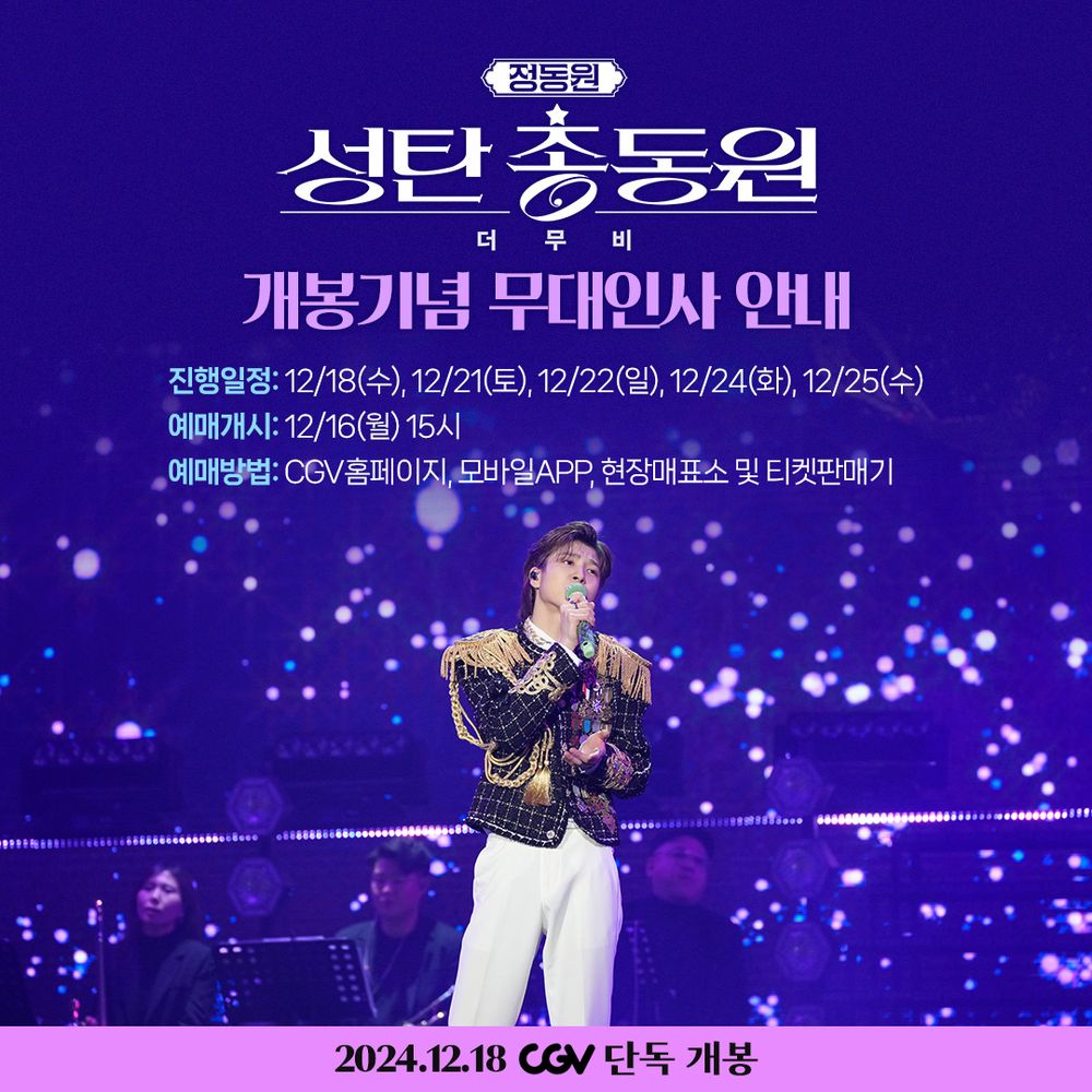 13일 정동원은 CGV 공식 계정을 통해 오는 18일 개봉을 앞둔 정동원의 콘서트 실황 영화 '정동원 성탄총동원 더 무비'의 무대인사 일정을 공개해 팬들의 기대를 끌어올렸다.