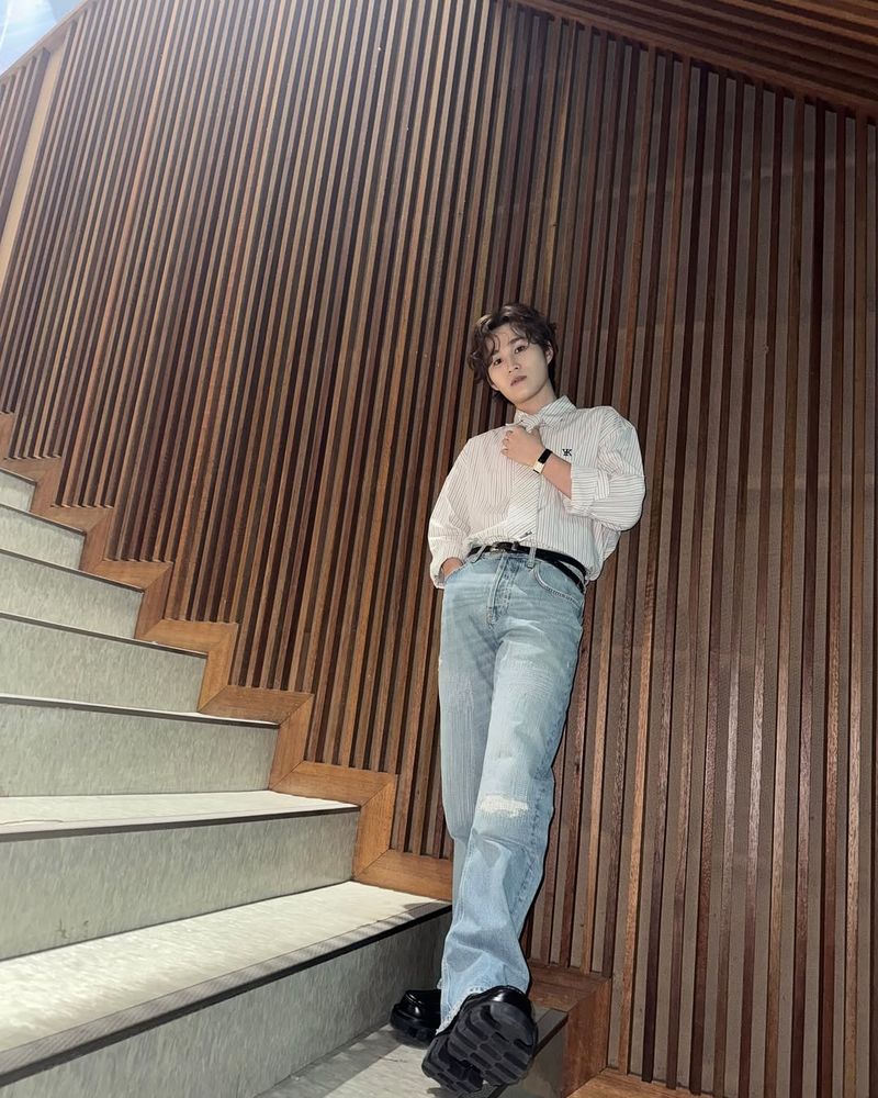 김희재는 스트라이프 패턴의 셔츠를 단정하게 착용하고, 연청 워싱의 데님 팬츠를 매치해 캐주얼하면서도 깔끔한 분위기를 연출했다. 발목 위로 살짝 올라오는 블랙 플랫폼 슈즈로 전체적인 룩에 안정감을 더하며, 세련된 실루엣을 완성했다.