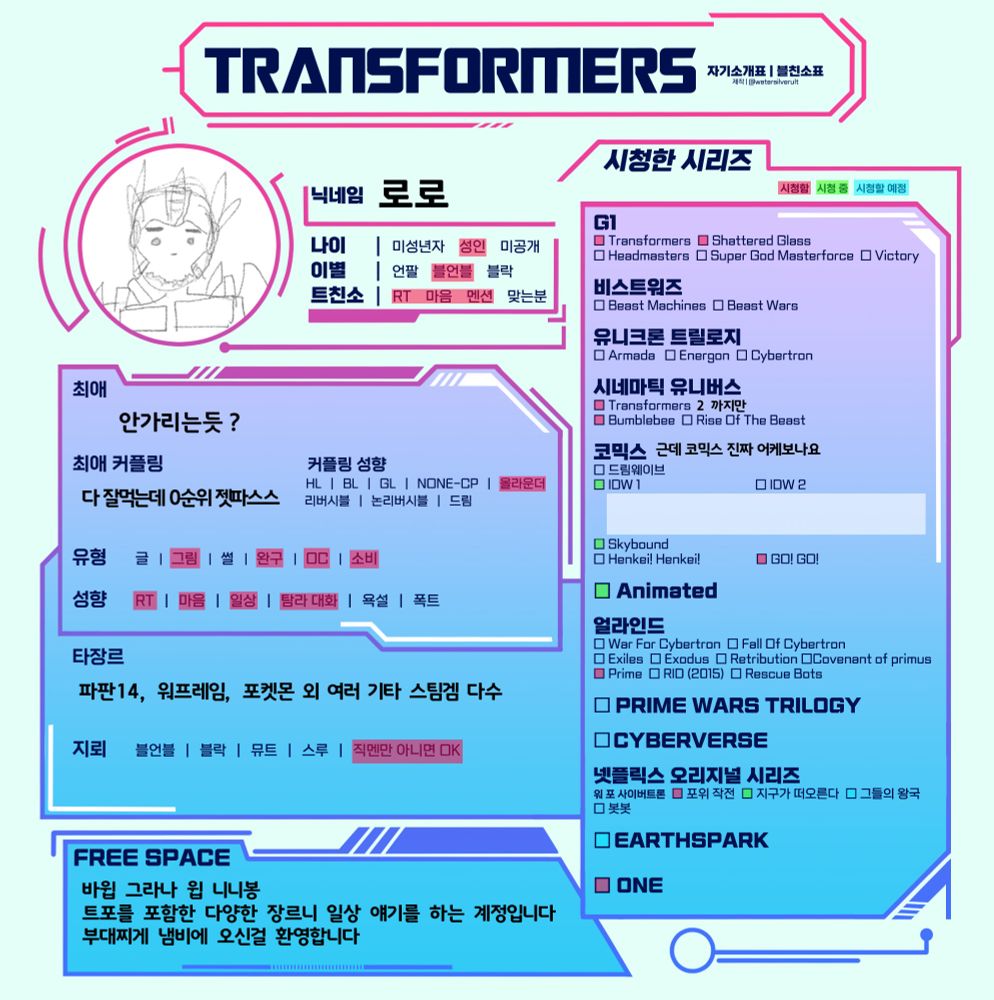 애니멧 넷포싸 프워 트릴로지 다 본 기념 #트포_블친소 #트랜스포머_블친소 좋아하는 거 좋아하고 특히 ***메옵메, 메옵리타에 미친*** 글도 쓰고 그림도 그리고 메크 이야기 많이 하는 올라운더 리버시블러를 피드에 둬보세요