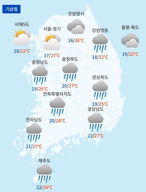 기상청에 따르면 오늘 전국은 대체로 흐리고 오후까지 대부분 지역에 비가 내리겠다. 특히 수도권과 충청권, 전라권에는 시간당 30∼50mm의 강한 비가 집중되는 곳이 있어 침수와 산사태 위험이 커 주의가 필요하다. 비가 내린 뒤에도 체감온도가 33도 안팎으로 올라 무더위가 이어질 전망이다.