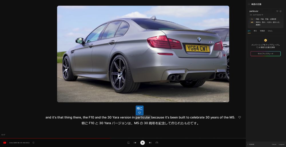 字幕の単語やセンテンスをクリックするだけで、AIによる意味解説、例文、音声を即時表示。未知語は自動ハイライトされ、ワンクリックで保存可能。専用単語帳として隨時復習に活用できます