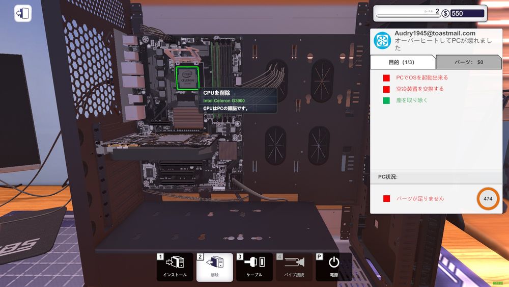 自作PCショップを開けるのは続編からで、本作は街の修理屋さんとなってひたすら交換パーツを予算内で収められるように買い集めるゲーム。