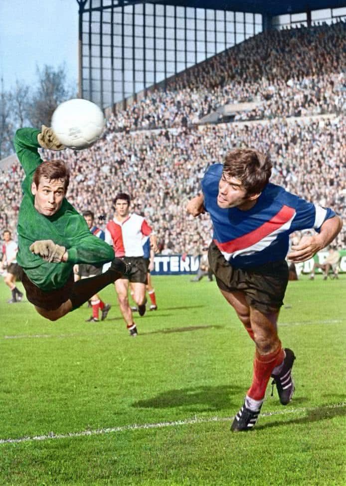 Goalkeeper #EddyTreijtel shots down a gull from a goalkick during #SpartaRotterdam v #Feyenoord, November 1970.