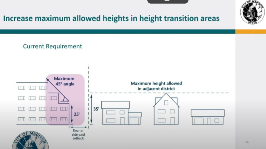Second proposal are changes to stepdown requirements. It would allow a height at the max allowed in the adjacent district before the stepback is applied. Right now they start at below the max height allowed in the adjacent district before the stepback.