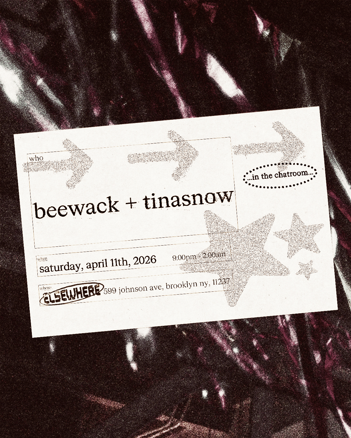 Beewack and Tinasnow bring an intimate electronic night to Chatroom at Elsewhere in New York City. Expect hypnotic synths, pulsating beats, and a club-ready vibe in the dim, immersive venue.