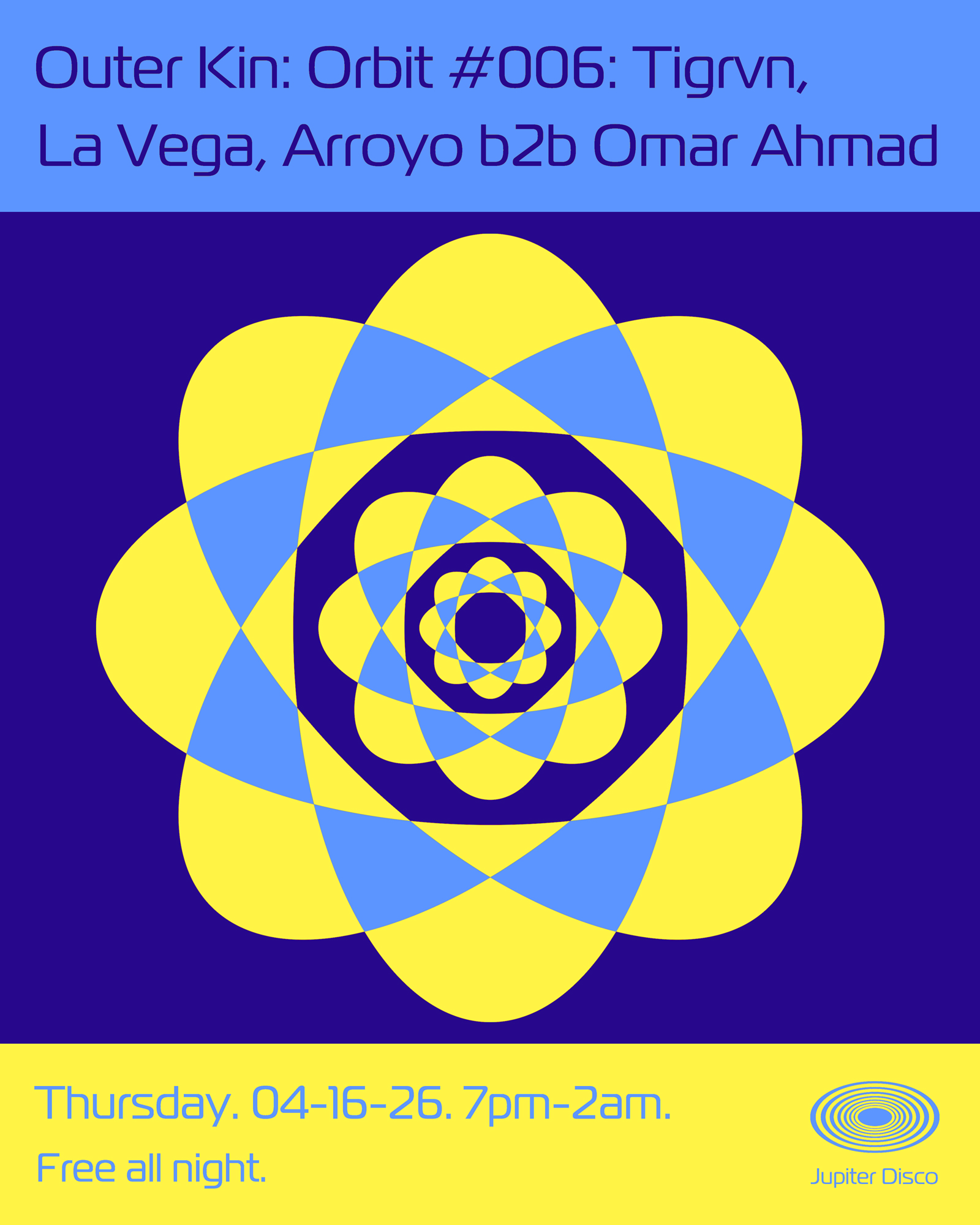 Outer Kin presents Orbit #006 at Jupiter Disco in New York City, with Tigrvn, La Vega, and Arroyo performing back-to-back with Omar Ahmad. An electric electronic club night in an intimate venue, delivering pulsing grooves, cutting-edge visuals, and late-night dancefloor energy.