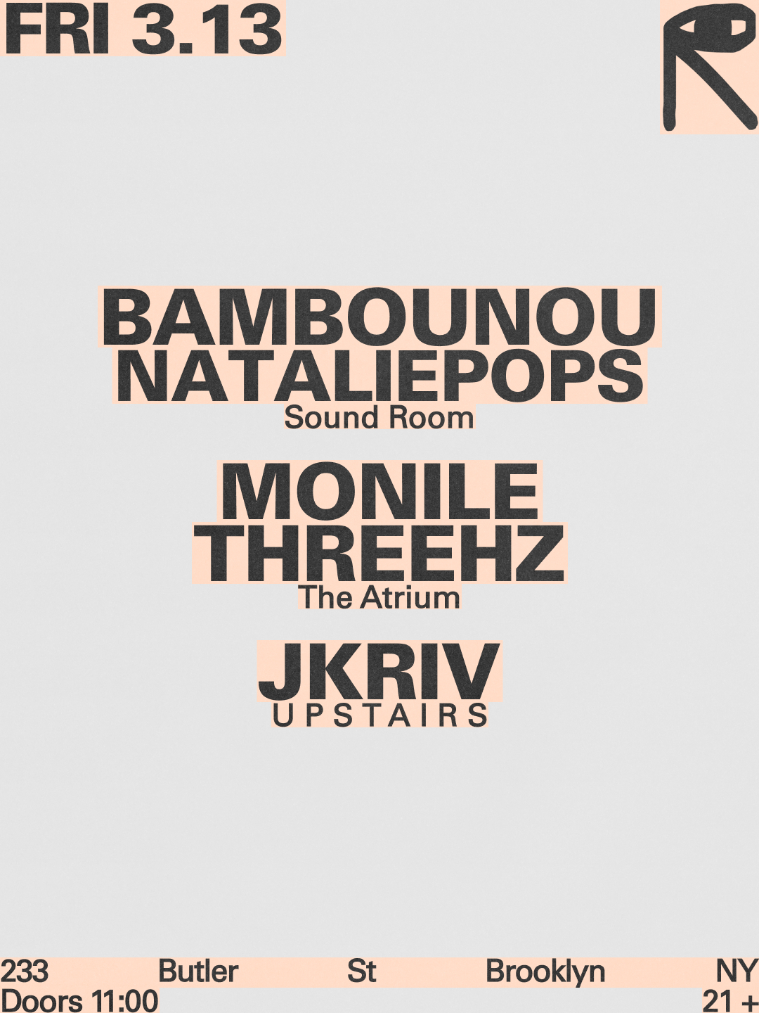 Techno night featuring Bambounou, nataliepops, Monile, threehz, and JKriv at Public Records.