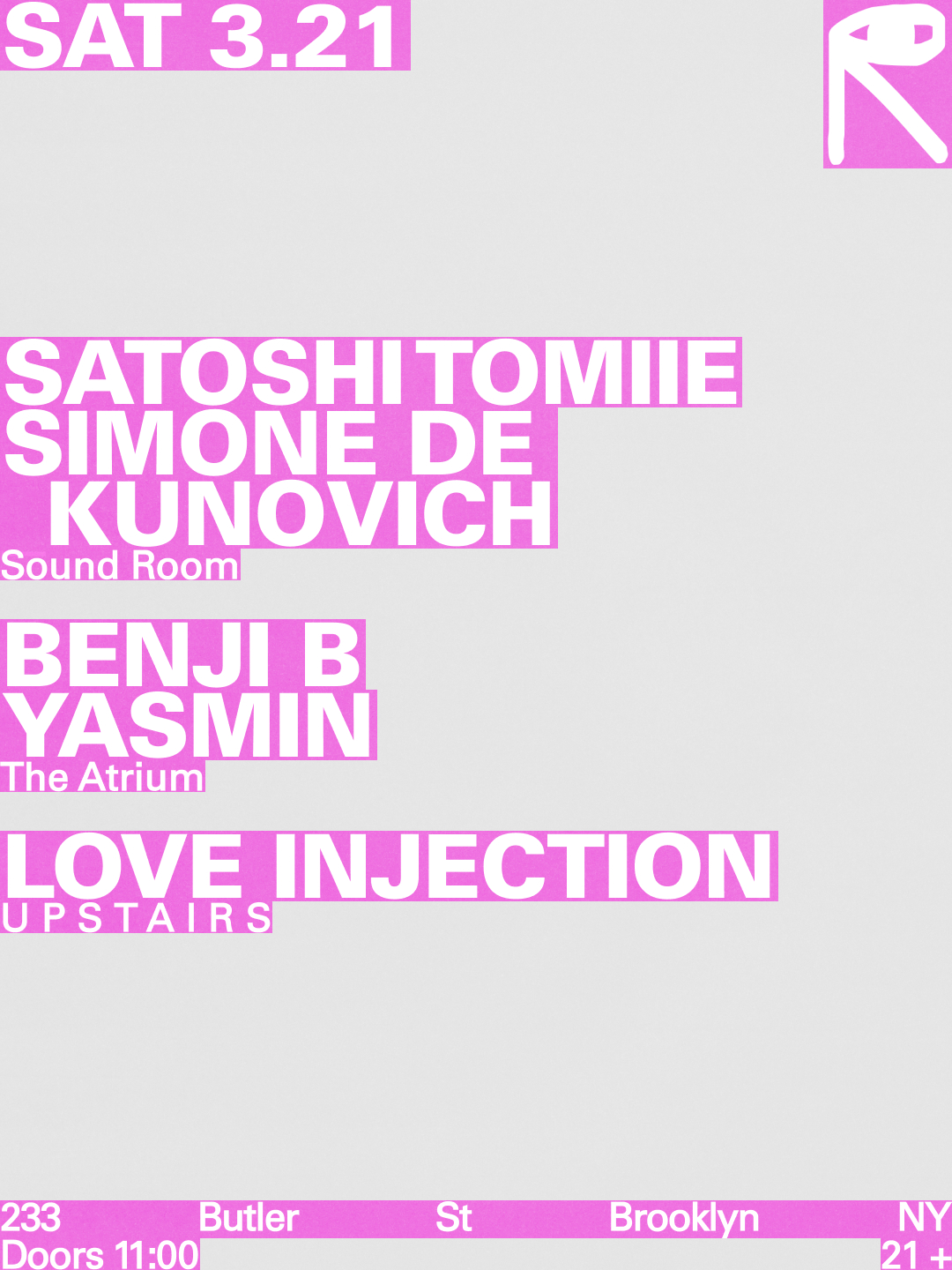 Satoshi Tomiie and friends bring a Brooklyn night of house heat to Public Records, with Simone de Kunovich, Benji B and Yasmin on the bill plus Love Injection, spinning deep grooves and timeless synths that glow in Public Records' intimate space.