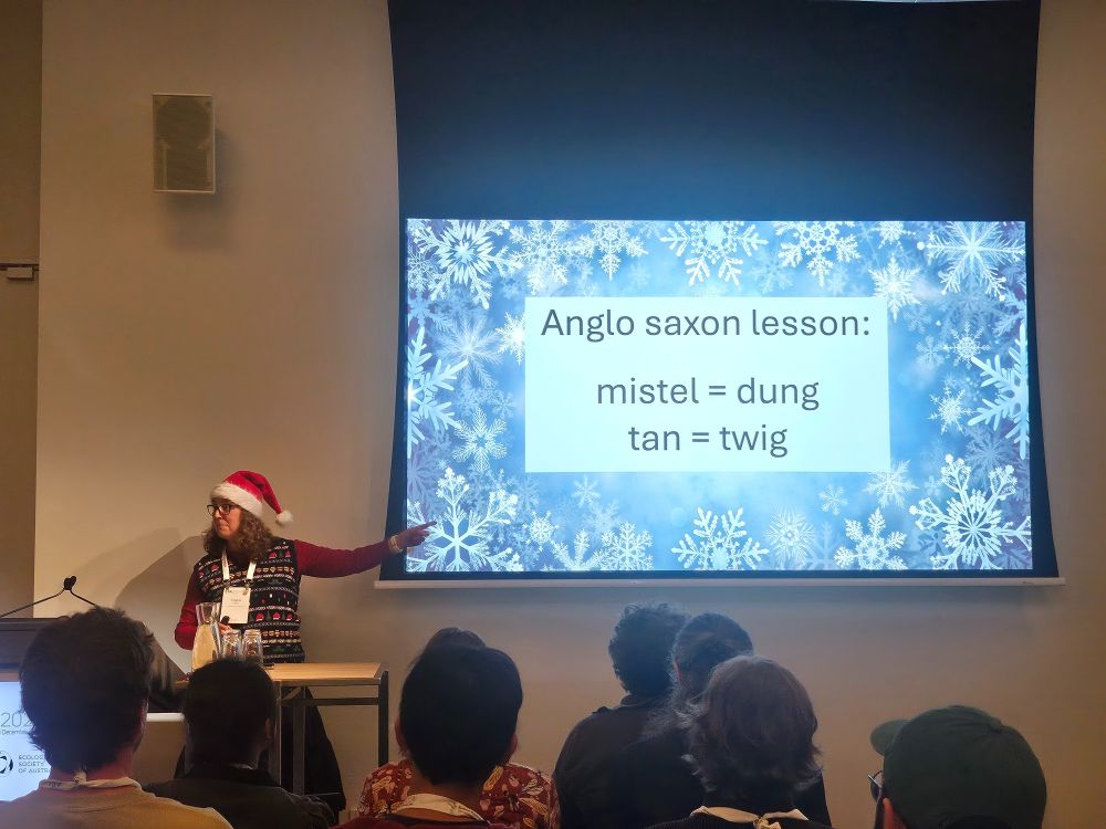 @angelamoles.bsky.social just brought me so much joy, being Christmasy and giving me to perfect intro to mistletoe, which I know nothing about. She discussed the importance of going out and testing theories (in this case to work out where mustletoe likely grows in trees) 🎄🌲 #ESAus2024