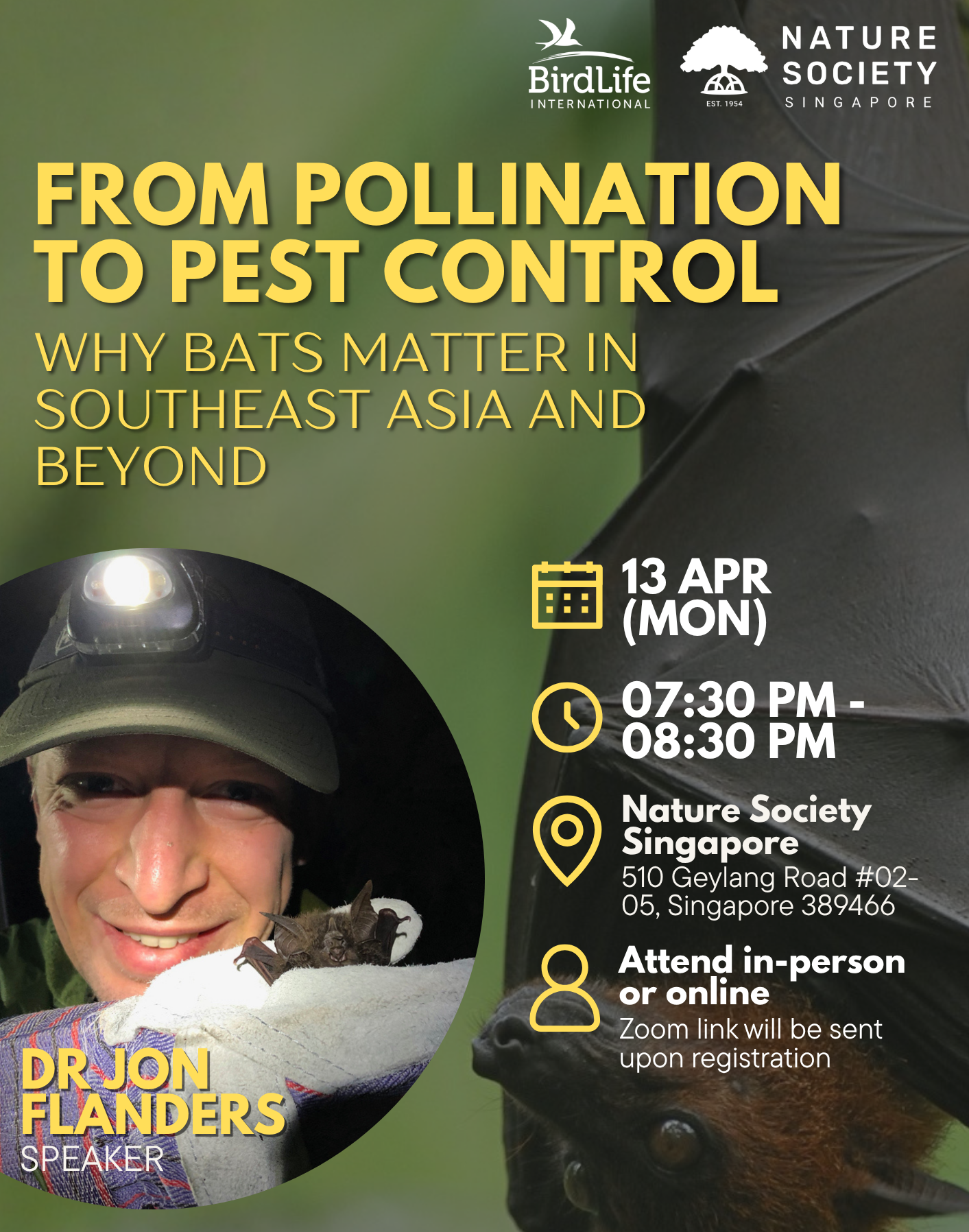 Dr. Jon Flanders explains the ecological and economic importance of bats, from pollinating crops to pest control, with examples from Southeast Asia to the Americas. The Singapore talk connects urban bat ecology to regional conservation efforts, showing how targeted actions safeguard species and ecosystems.