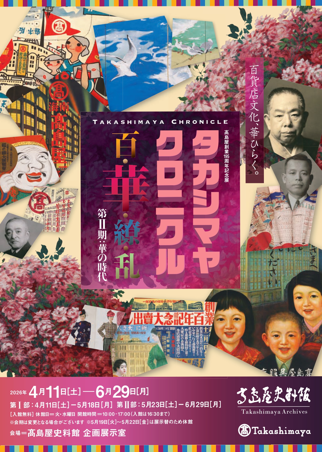 Takashimaya Chronicle: Hyakka Ryoran II — The Age of One Hundred は、東京の Takashimaya Archives で開催される室内のアーカイブ展示です。考古学・歴史・民俗を扱い、資料や物語で百年の年代記をたどる内容で、2026年6月29日まで展示されます。