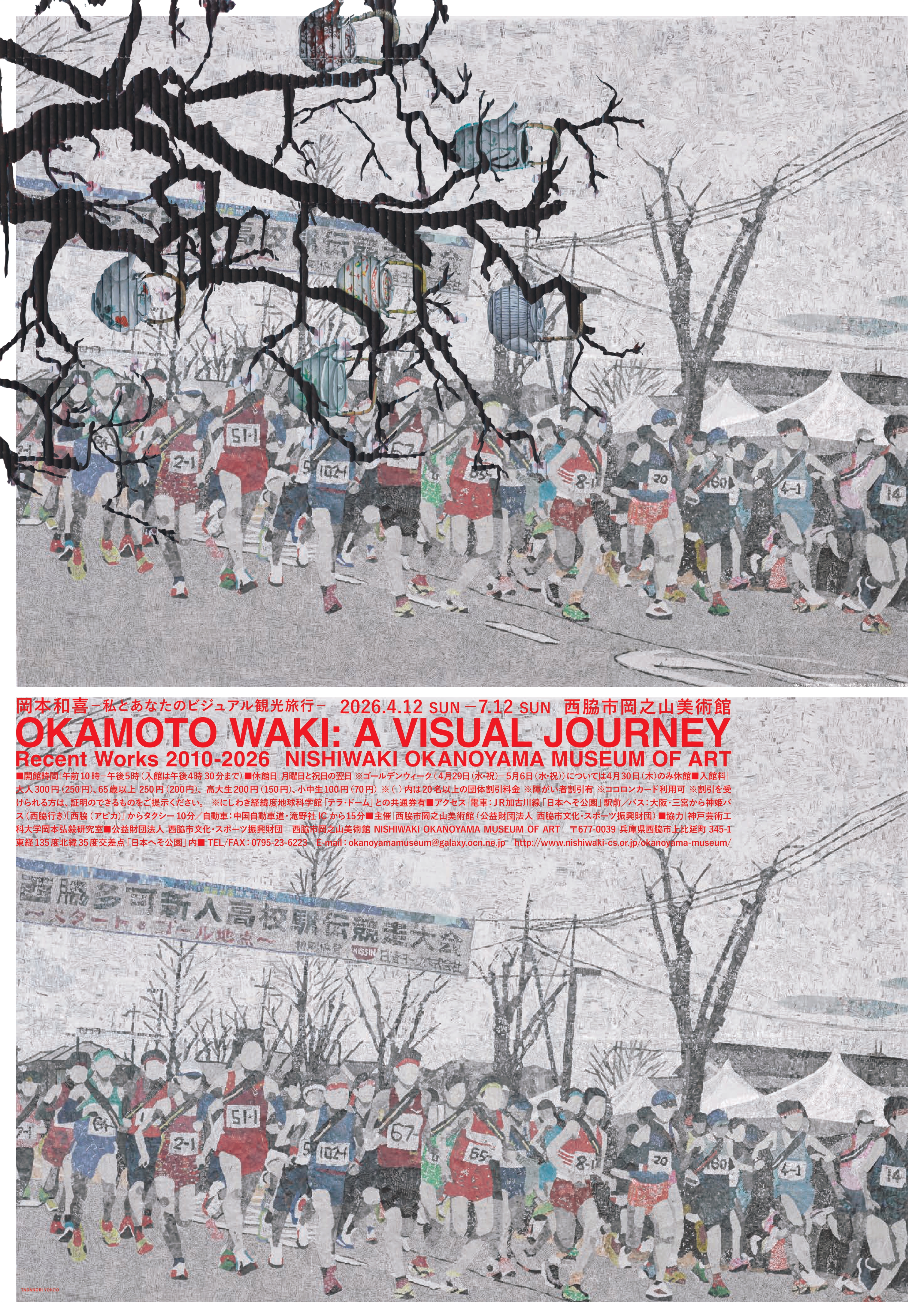 Okamoto Wakiの絵画、彫刻、インスタレーションを含むマルチメディア表現を没入的に紹介する展覧会。Nishiwaki Okanoyama Museum of Artで2026年4月12日から7月12日まで開催され、作家の変化する表現を通じた一貫した視覚の旅を体験できます。