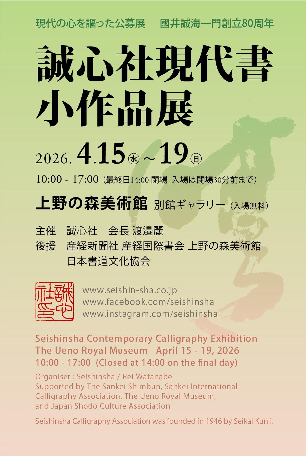 Seishinsha Contemporary Calligraphy Exhibitionは、東京のUeno Royal Museumで2026年4月15日〜19日に開催され、Seishinshaによる描画に焦点を当てた作品を展示します。博物館の空間で伝統と現代表現を融合させた、現代日本の書を身近に紹介する展覧会です。