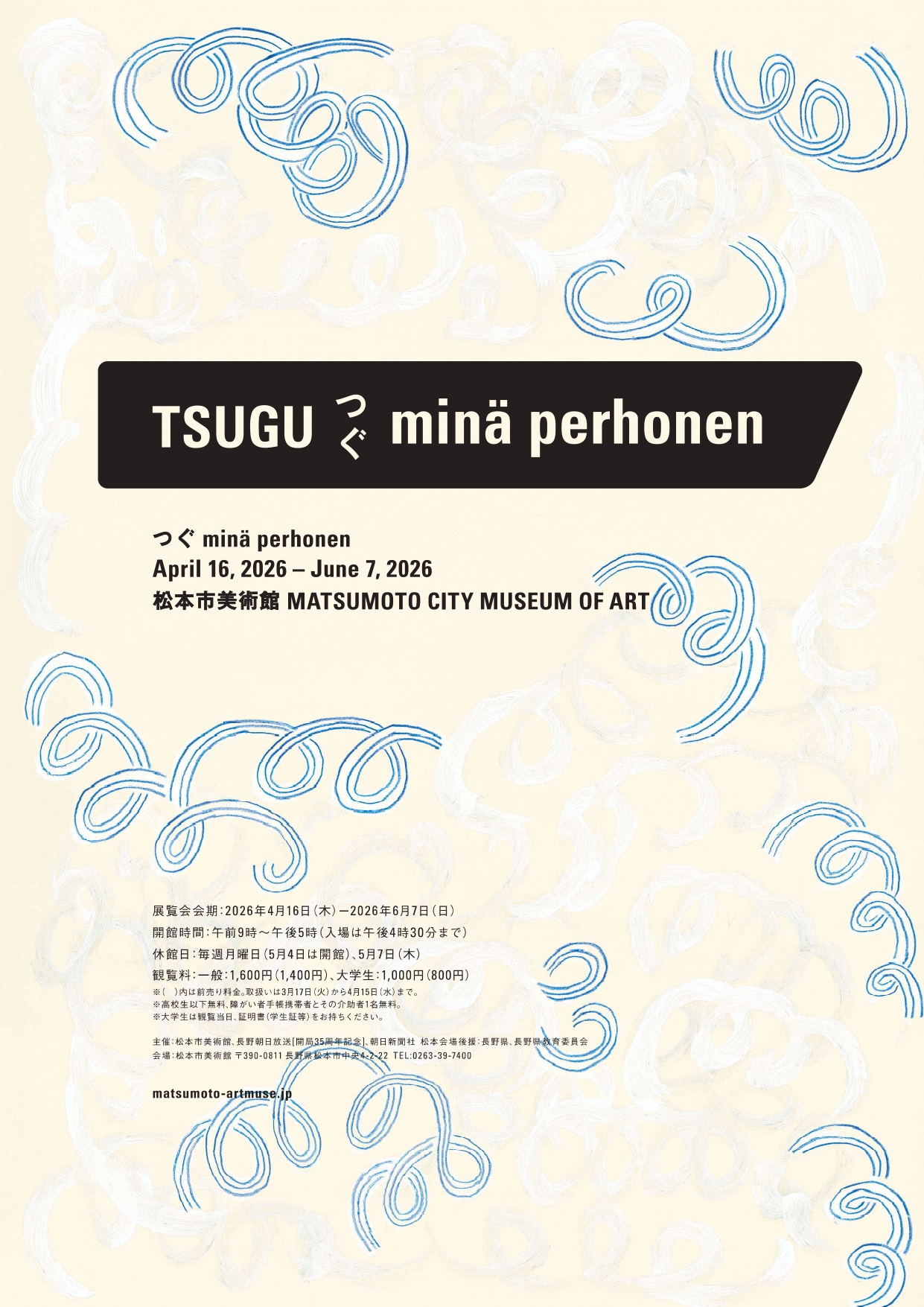 Tsugu minä perhonenはMatsumoto City Museum of Artで開催される、Minä Perhonenによるファッションとテキスタイルデザインを紹介する展覧会です。2026年4月16日〜6月7日、現代的なクラフトと着られるアートを融合し、テキスタイル、色彩、シルエットを洗練された美術館空間で際立たせます。
