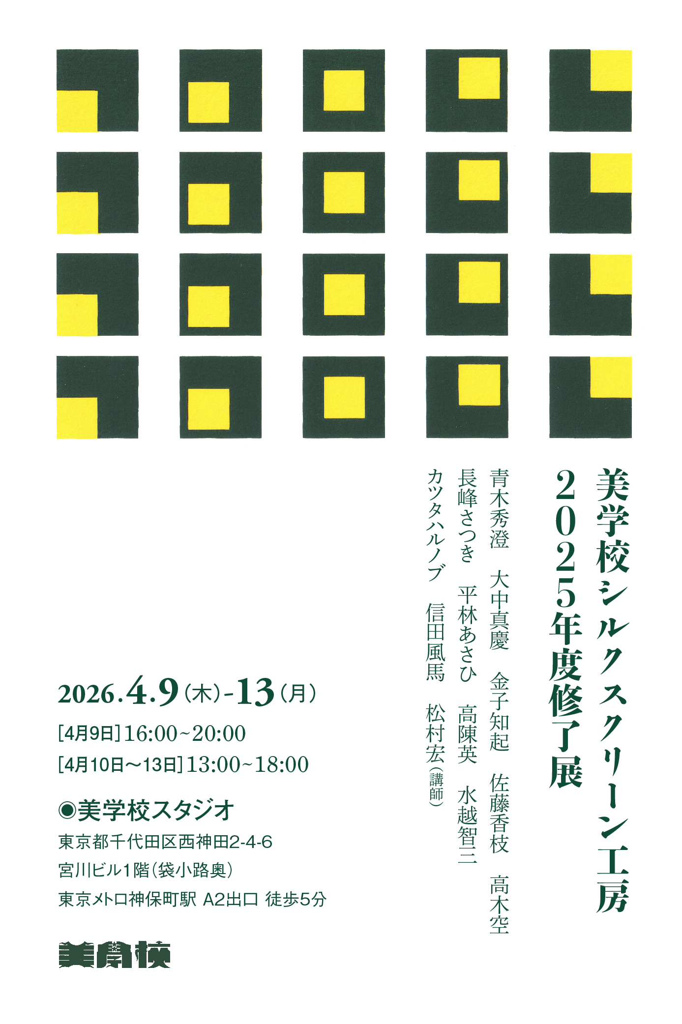 仕上げワークショップで制作されたシルクスクリーン作品を展示するこの展覧会は、東京のBigakko Studioで学生の作品とスタジオのシルクスクリーン工程を紹介します。来場者は2026年4月9日〜13日に、親密で体験型のギャラリー空間でコンセプトからプリントに至る制作の過程を見ることができます。