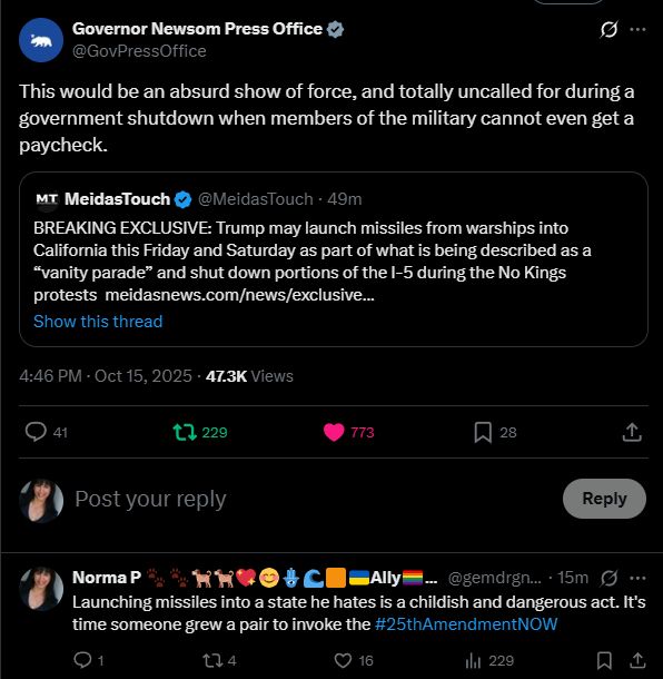 Please repost this far and wide. This is utter insanity for someone who's supposed to be protecting ALL states. Instead, he wants to send missiles to us in California because he hates our state. Someone please grow a pair and invoke the #25thAmendmentNOW