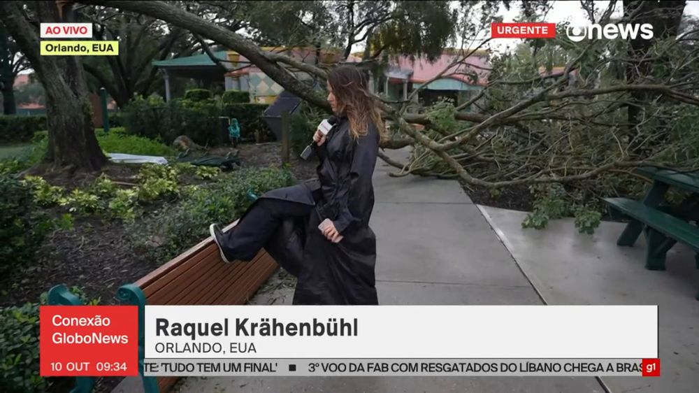 Raquel Krähenbühl cobrindo a passagem do Furacão Milton direto da Flórida no dia do seu aniversário