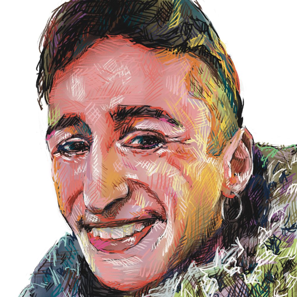 Portrait artist combining drawing & knitting w/ digital tools.
