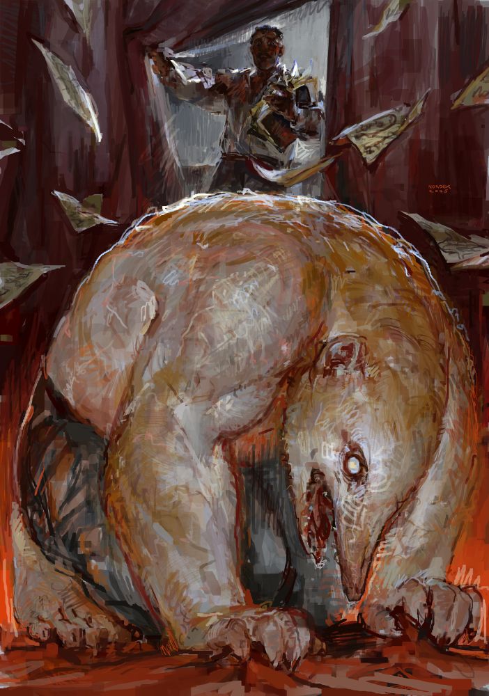 a cadre of oversized police officers herd a fleeing crowd through a dark landscape