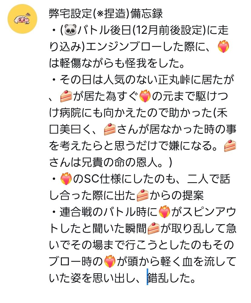 🍰「私だって今はもう一端の走 り 屋なのにすーぐ『🐼、🐼』ってどんだけ🐼君好きなのよ、そりゃ確かに🐼君は凄い子だけどさぁ私❤️🔥さんの会話に付いていける知識は🐼君より全然まだある方だと思うのになぁ~。やっぱり『本物の走りは男にしか分からねぇ』とか根強く思ってるのかなぁ。