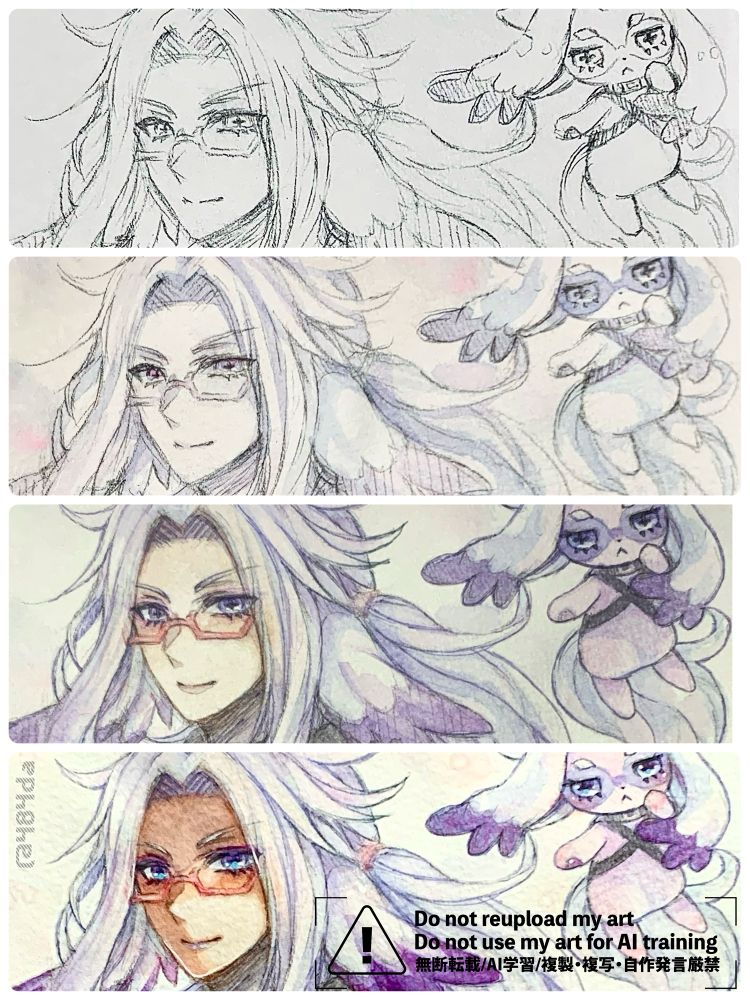 シャーペン画→影ベース塗り(水彩)→着色(水彩)→仕上げ(シャーペンとボールペンで少し加筆・ホワイト入れ) の流れで…