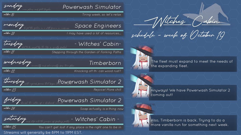 Had to finalize a few changes on the schedule this week. Going to be starting a new chill game Tuesday!