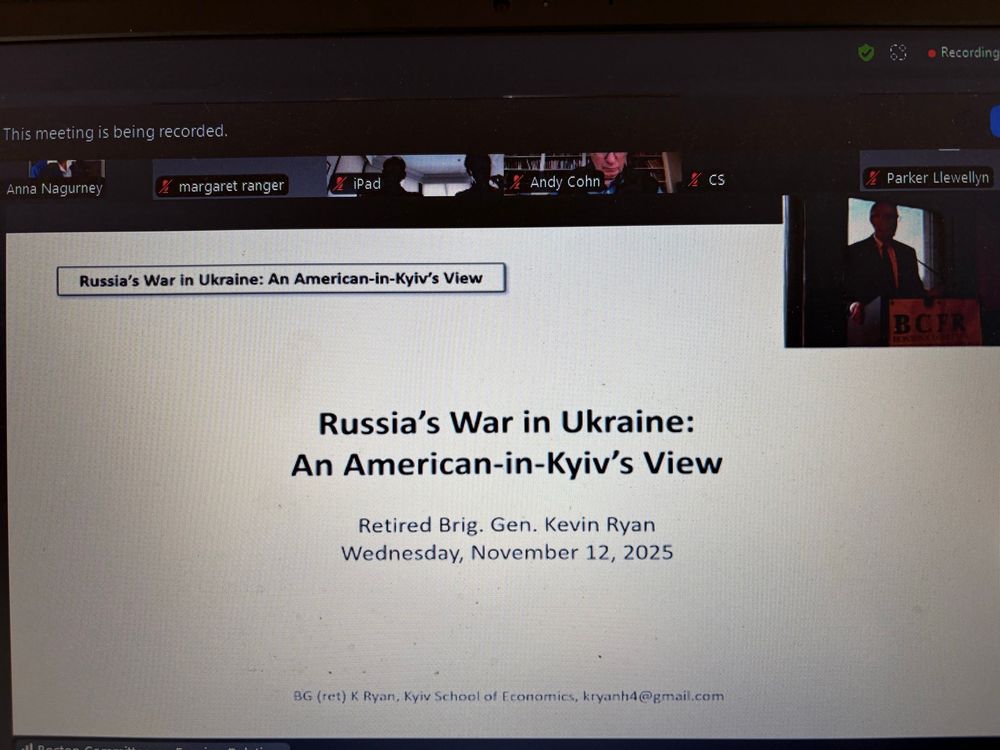 Listening to a very engaging presentation by Army Brigadier General Kevin Ryan, who is also a Visiting Professor at the Kyiv School of Economics (KSE), speaking to the Boston Committee on Foreign Relations. Thanks to @rmtownsend.bsky.social for informing me about his talk on Russia's War on Ukraine.