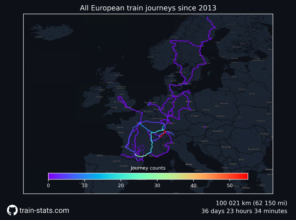 Difficile de comparer entre les opérateurs vu la différence d'usages (j'ai quasi toujours pris les CFF avec l'AG night, donc ils apparaissent peu ici, idem pour les DB et l'Interrail).
