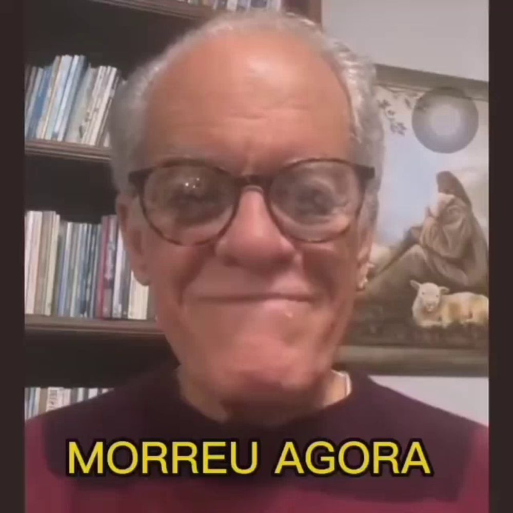 ALT: a man wearing glasses says morreu agora in front of a picture of jesus